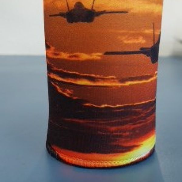 This Legacy branded drink cooler is overlocked top and bottom for additional strength. The aircraft stand out on the orange sky bakground.
