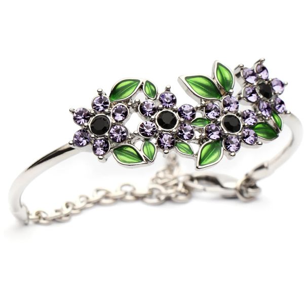 This exquisite bracelet is a graceful tribute to the often-overlooked heroes of war — the animals who served beside our troops with loyalty and without question. Designed in an elegant asymmetrical style, it features four radiant purple poppies, each formed from rich purple and black diamantes that shimmer with depth and sentiment. Surrounding the blooms are delicate green enamelled leaves, their soft curvature adding contrast and natural beauty to the design.